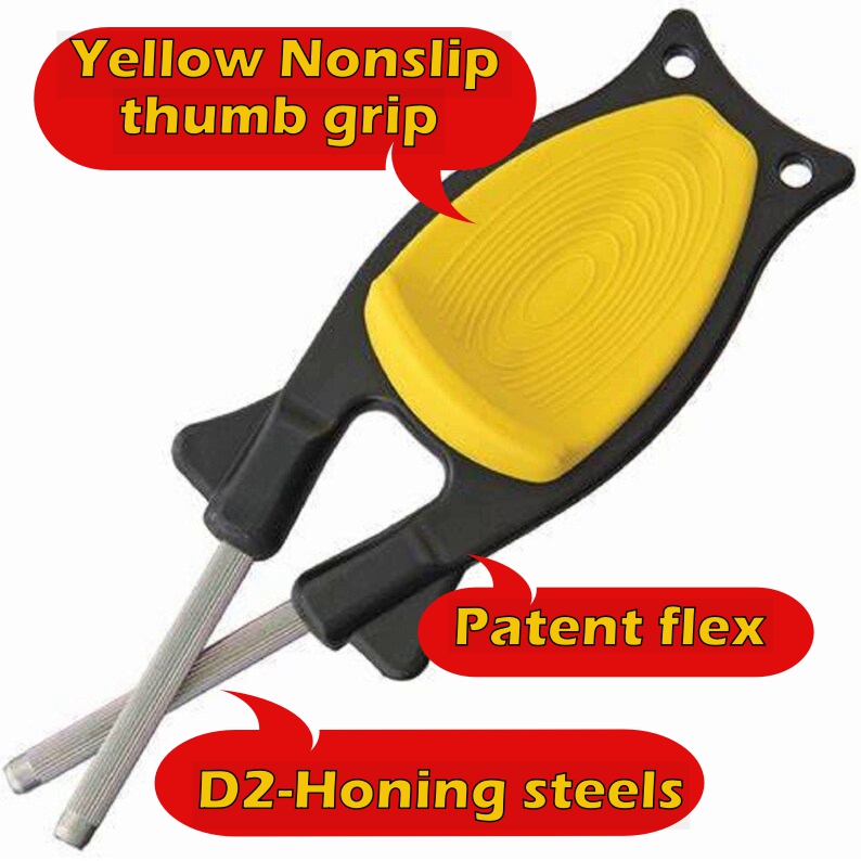 We can sharpen any cutting edges. gift ideas for $25 Our Knife sharpeners have a unique flex design made in the knife sharpeners handle that allow the honing rods to adjust to your knife edge. There for you can only make your knives sharper when drawing your blades threw the Honing rods. We can sharpen your Kitchen knives, Pocket knives, Hunting knives, Swords, Daggers, Hatchets, Machetes, Scissor and any style serrated edges. See how to videos on our sight.