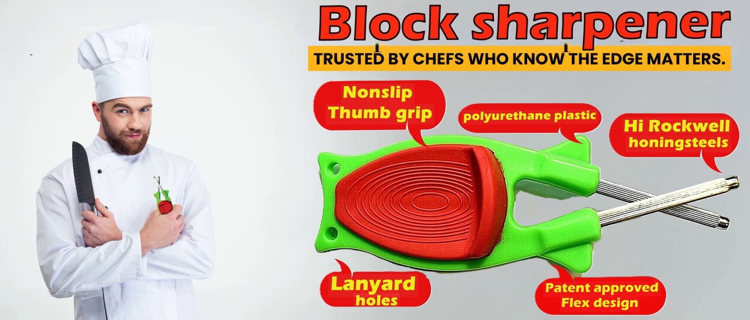Your quest for the greatest knife sharpener, since the stone age ends here. Block knife sharpeners are a patent knife sharpener that’s honing rods are made to flex. So, they pick up and flow knifes original cutting edge. Taking all guess work out of sharpening knives.