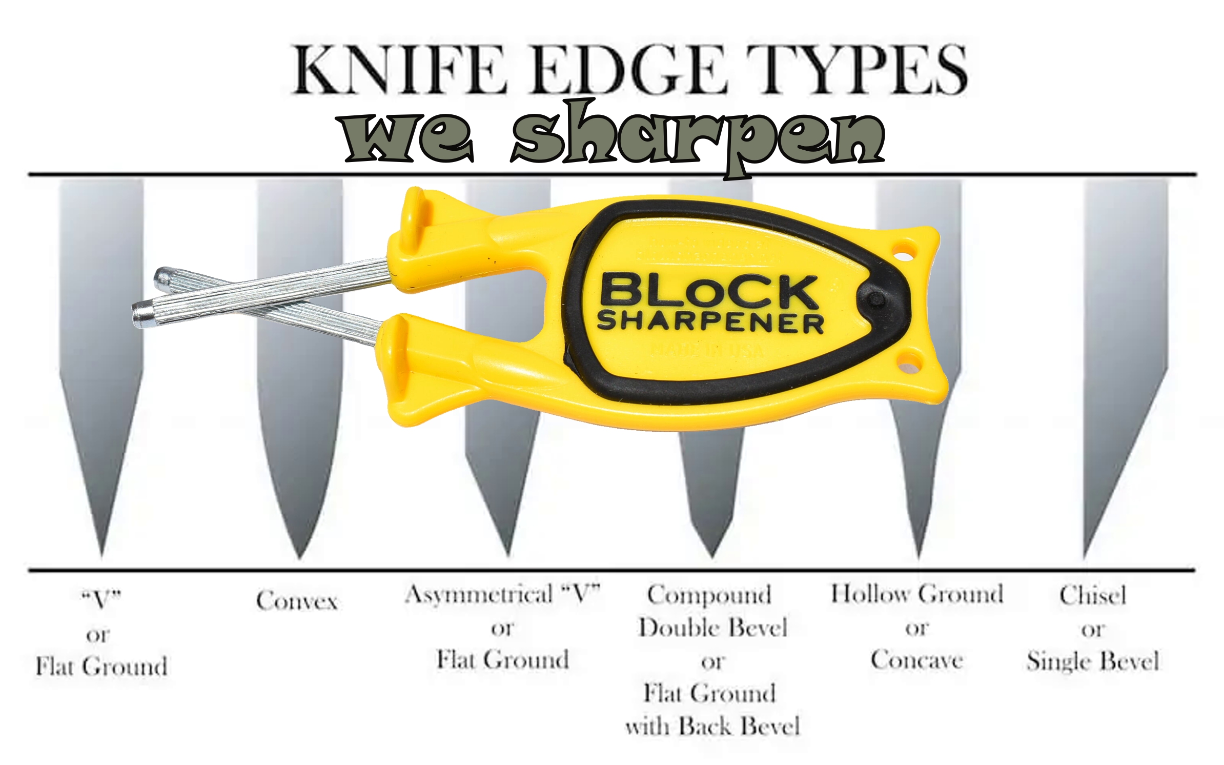 We can sharpen any cutting edges. Our Knife sharpeners have a unique flex design made in the knife sharpener handle that allow the honing rods to adjust to knifes cutting edge. There for you can only make your knives get sharper when drawing your blades threw the Honing rods. We can sharpen your Kitchen knives, Pocketknives, Hunting knives, Swords, Daggers, Hatchets, Machetes, Scissor and any style serrated edges. See how we do it videos on our Web sight.