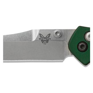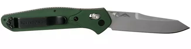 The Benchmade Mini Osborne 945 is a stunning pocketknife with a slim design. You can immediately tell that a lot of attention was paid to the design. The ridged titanium spacer in between the scales is enhanced with a red anodized finish. This is in nice contrast with the green aluminium handle. The handle feels rougher than is usual for aluminium. Great, as it means you have more grip over the knife. The blade shape is also particularly beautiful with its tanto-like shaped tip. The knife is pleasant to wear due to its low weight. Equipped with a pocket clip. The clip can be attached to the knife on the left or right.