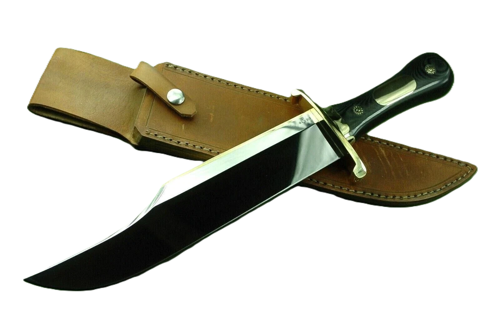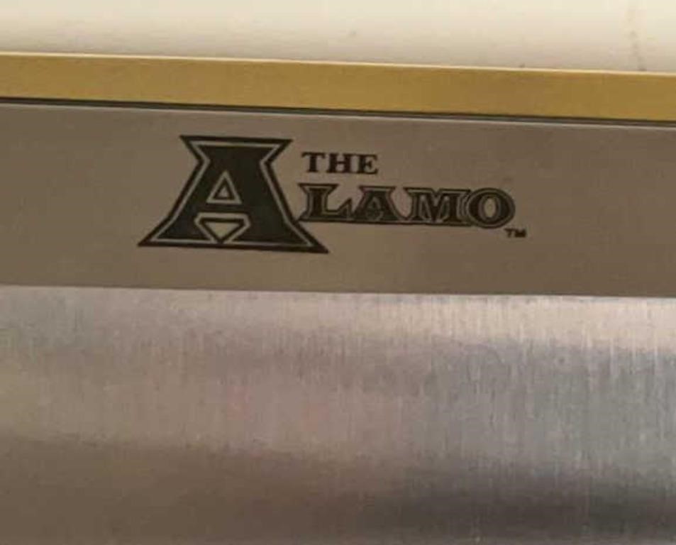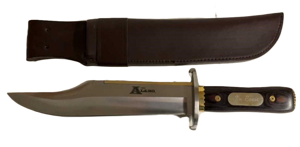 ALAMO BOWIE KNIFE The 1960 movie, THE ALAMO, starring John Wayne and Richard Widmark, is the legendary true story of a small band of soldiers, including Davy Crockett and Jim Bowie, who sacrificed their lives in fierce combat against a massive army in order to prevent a tyrant from smashing the new Republic of Texas.Measuring an impressive 17″ overall, it boasts an 11″ 420 stainless steel blade and genuine wood handle with brass fittings. This is an exact reproduction of the knife carried by Richard Widmark as the legendary Jim Bowie in the movie.This Officially Licensed Museum quality replica has been crafted with pride from the finest materials available and comes complete with a matching top grain leather sheath, and Certificate of Authenticity.John Wayne’s The Alamo Bowie Knife Prop Replica