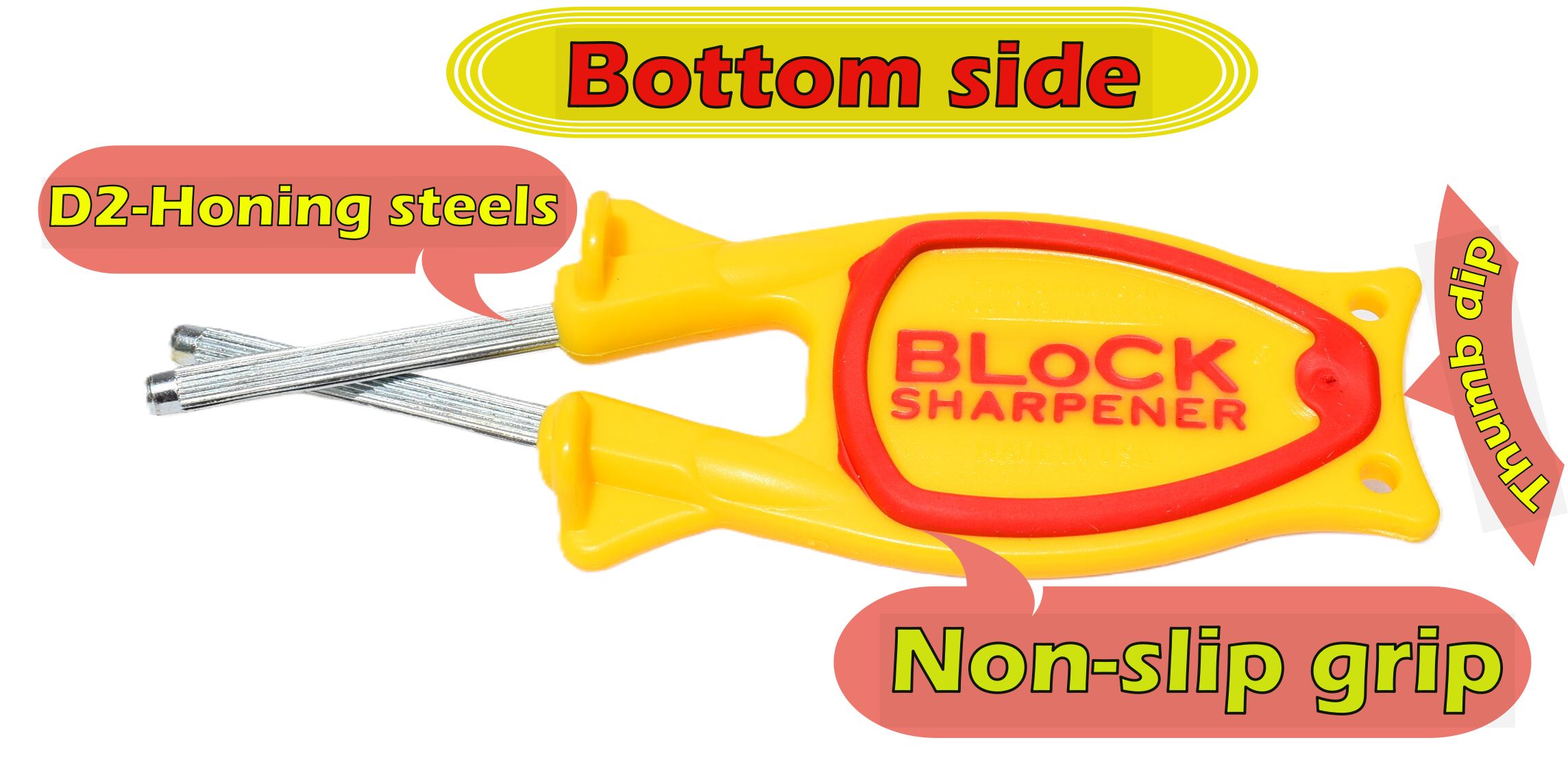 Stay sharp and safe with Blocks new patent nonslip grip thumb grip. Our handheld Knife sharpener, handle has a new patent non-slip grip over shot added to bottom and top side of the knife sharpener; The Red ring you see in this image gives you great grip when using them on flat slippery surfaces also added non- slip grip over the thumb grip and guard on the top side. This thumb grip gives you great control when sharpening knives. Sharpens Pocketknives, Kitchen knives, Hunting knives, Kitchen