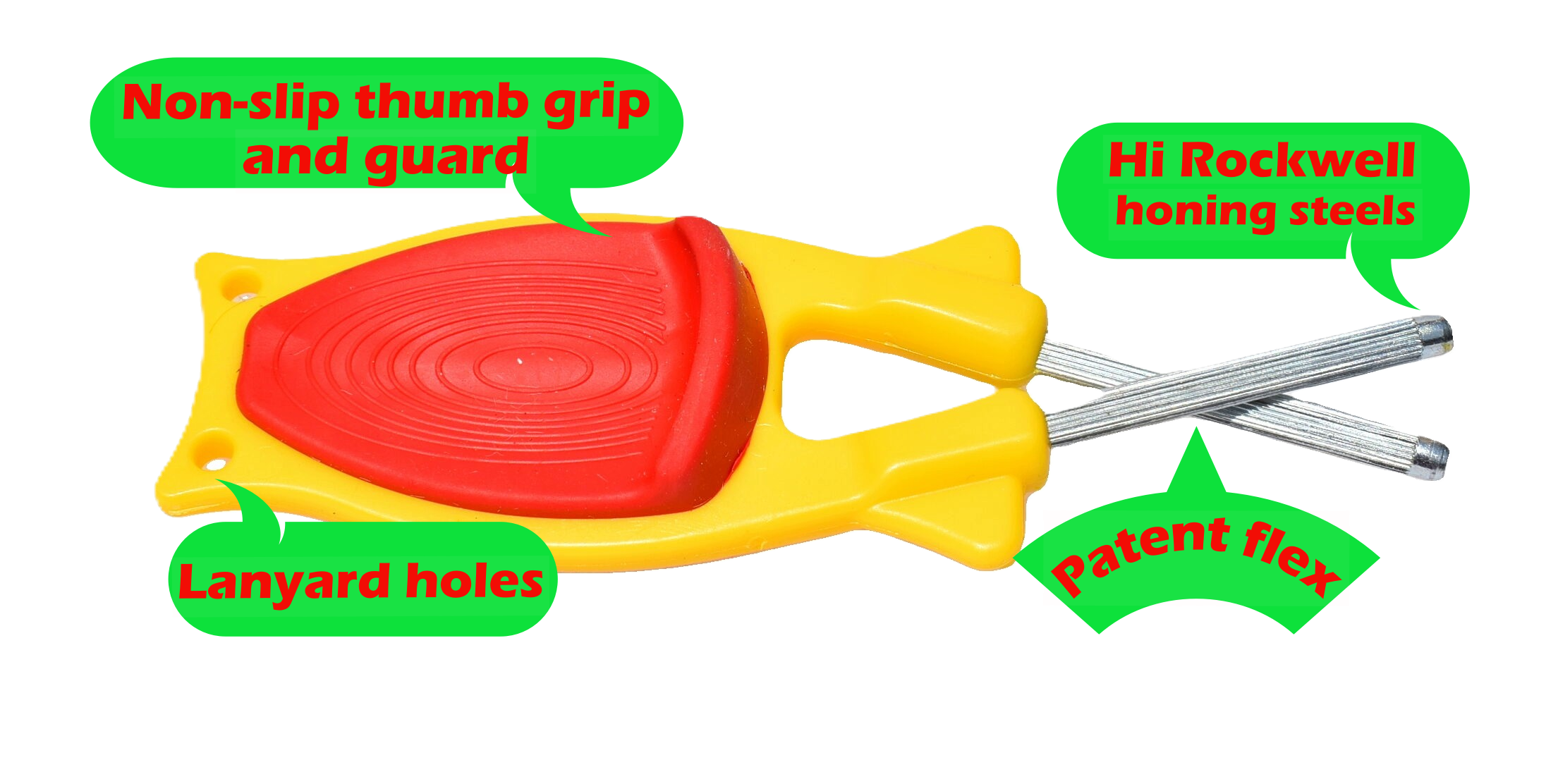 Handheld knife sharpeners you can sharpen many different cutting edges with. Our handheld knife sharpener has a unique flex design made in the knife sharpeners handle that allow the honing rods to adjust to your knife edge. There for you can only make your knives sharper when drawing your blades threw the honing rods. We can sharpen your Kitchen knives, Pocketknives, Hunting knives, Swords, Daggers, Hatchets, Machetes, Scissor and any style serrated edges. See how to video’s on our web sight.