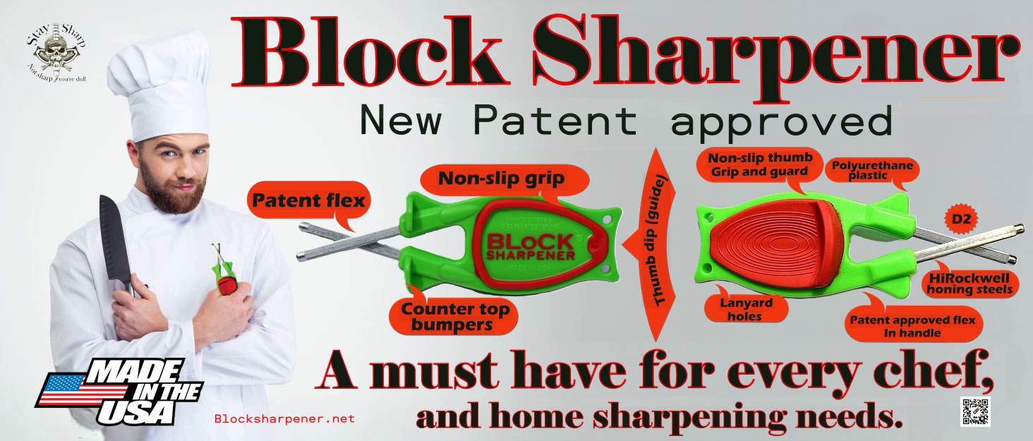 Original Block knife sharpener updated re- patented new D-2 model.                                                                                                                                                                                                            Block Knife Sharpener, we provide top-notch, American-made knife sharpeners built to stand the test of time. Our patented sharpener, simply called “Block,” is crafted to suit the needs of outdoorsmen, professional chefs, and home cooks alike. Proudly made in the USA, our sharpeners come with a lifetime guarantee against factory defects, so you can count on them for years to come.
