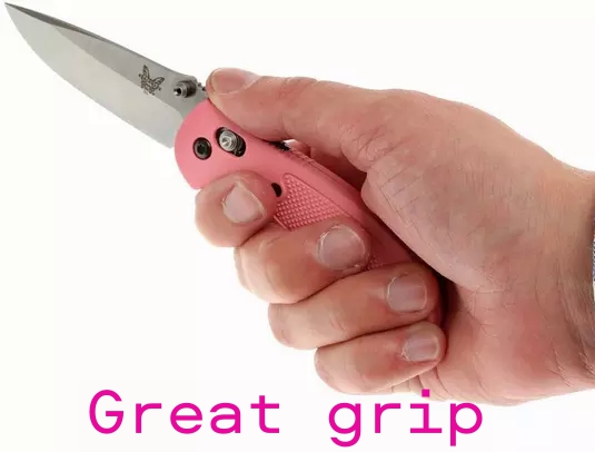 ย The Griptilian Series in S30V! The 556-PNK Benchmade Mini Griptilian is a compact workhorse of an EDC, designed by Mel Pardue, that features a 2.91 inch drop point blade made of CPM S30V premium stainless steel, .100 inches thick, with a notched thumb ramp for secure grip, and dual thumb studs for ambidextrous one hand opening. The pink GFN (glass filled nylon) handle, 3.87 inches closed, has checkered texturing and notches for secure purchase, sturdy AXIS Lock, and a side to side reversible pocket clip mounted at the butt end. The Benchmade 556 Mini Griptilian Knife has an overall open length of 6.78 inches, and it weighs 2.81 ounces. Proudly made in the USA.Benchmade Knives: Benchmade Mini Griptilian S30V Knife, Drop Point Pink GFN, BM-556PNKย