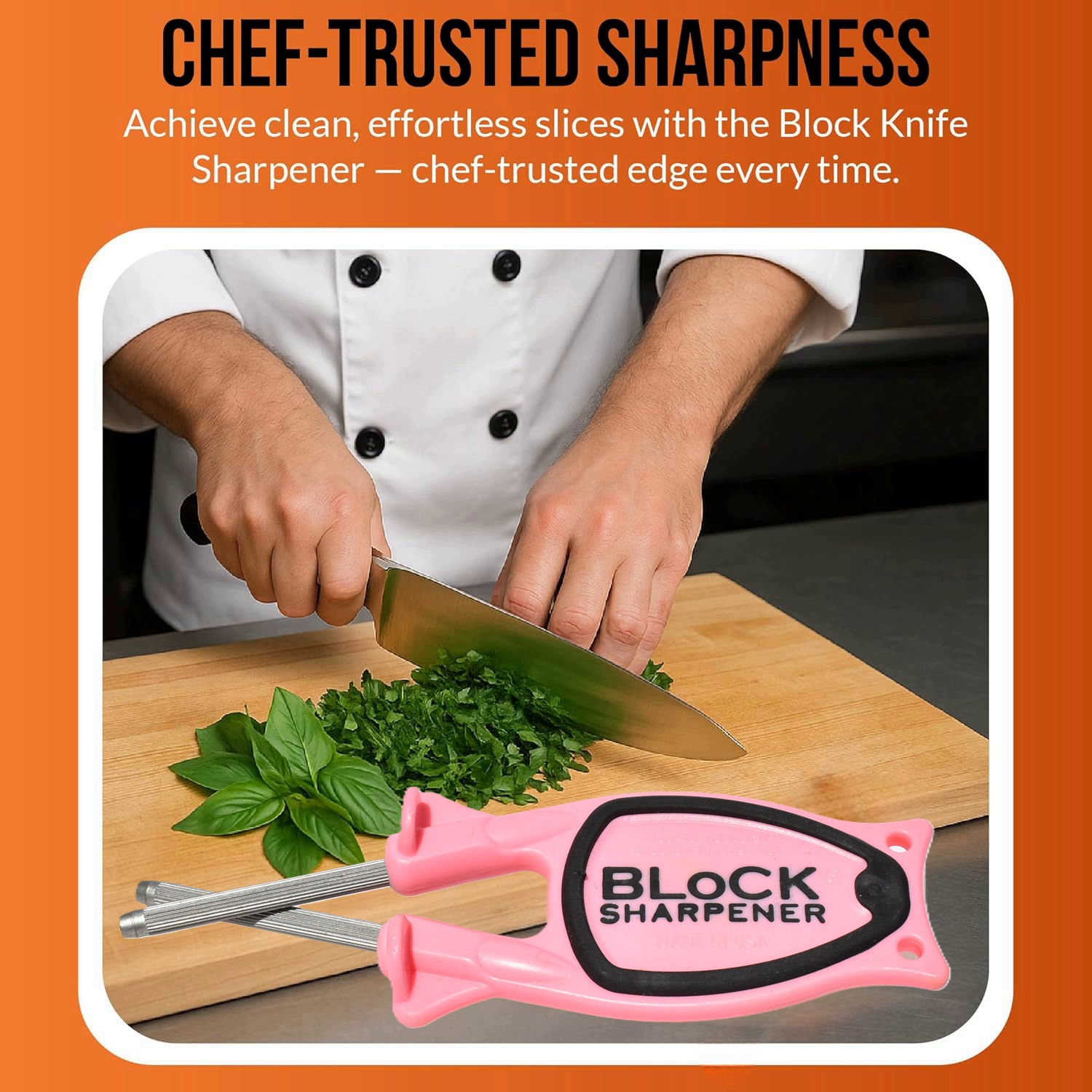 - Block’Pink Sharpener isnโt your run-of-the-mill knife sharpener; itโs a game-changer. Its unique patent flex in the sharpener handle design is nothing short of revolutionary. This feature enables the honing rods to adjust to any blade or cutting edge, making it incredibly versatile.